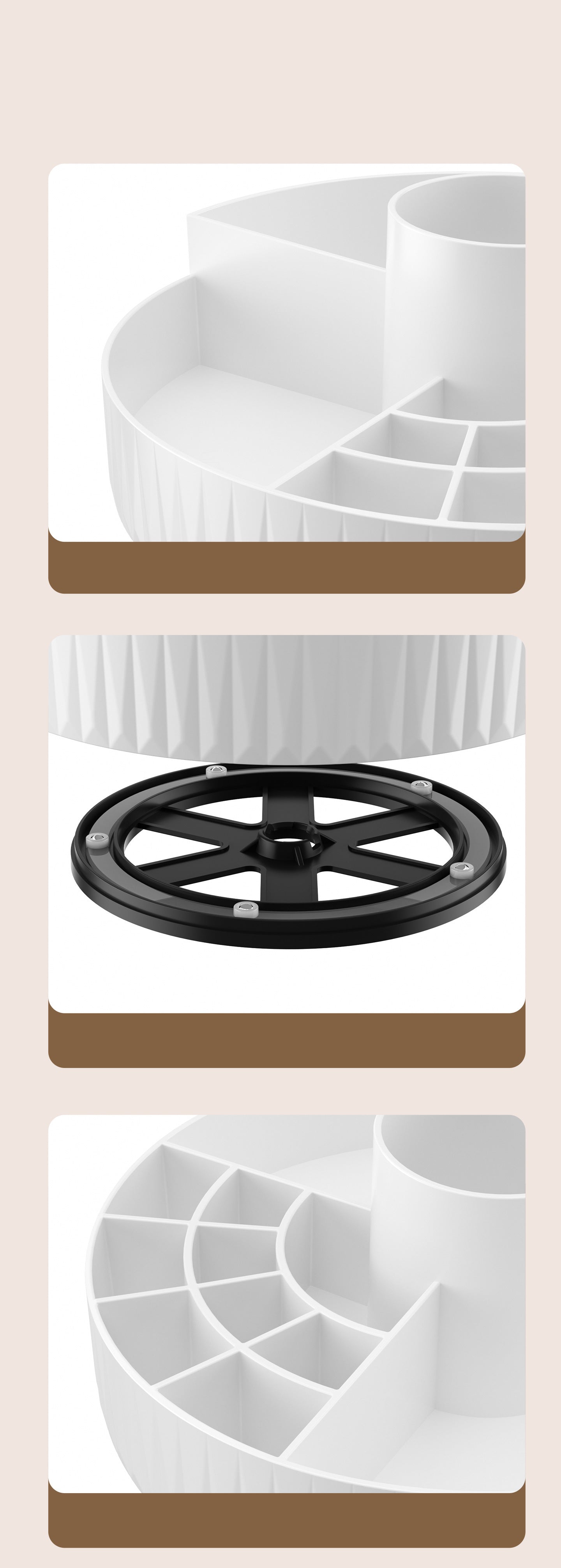 With a simple and stylish appearance, it is suitable for placement in spaces such as bathroom vanities, dressing tables, and kitchen countertops, making efficient use of corners and vertical space. The stable base ensures smooth and quiet rotation, along with strong load-bearing capacity, making it a practical choice for improving storage efficiency and enhancing home aesthetics.