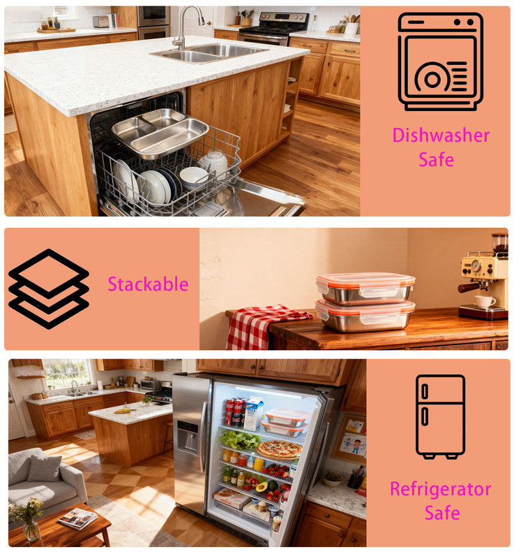 【Dishwasher-Safe Easy Cleanup The smooth stainless steel snack containers interior wipes clean effortlessly. Toss it in the dishwasher after use and enjoy hassle-free meal.